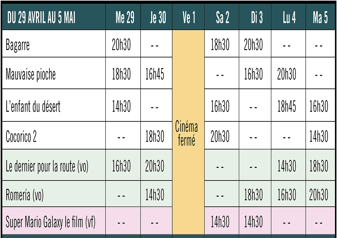 Horaires du 29 avril au 5 mai